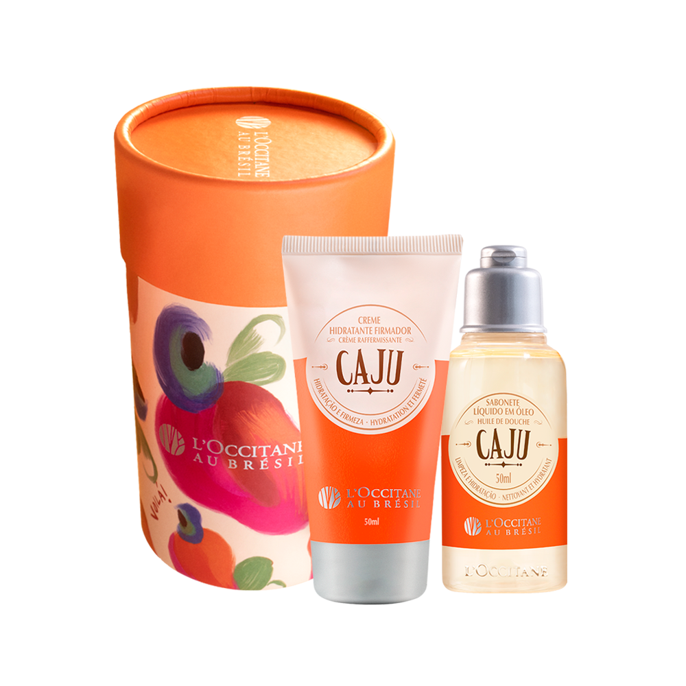 Essa composição contém Mini Caixa Presenteável, Sabonete Líquido em Óleo Caju 50ml e Creme Hidratante Firmador Caju 50ml. Uma linha de cuidados que proporciona uma ação firmadora na pele imediatamente após a aplicação.